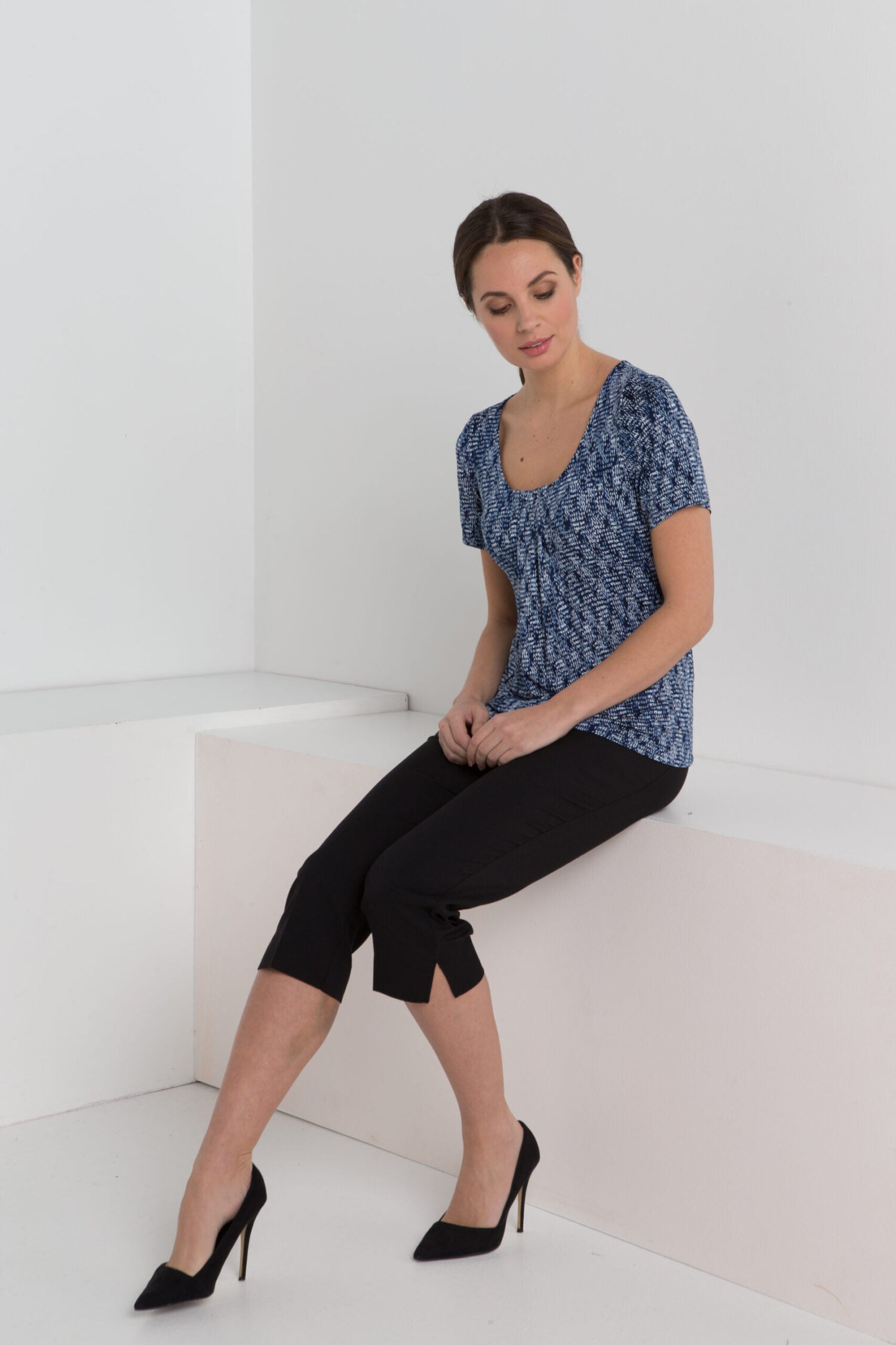 The 3/4 skinny leg low-rise capri pant with pockets in Mechanical Stretch Poly/Viscose is a trendy and comfortable garment designed for warm weather and casual occasions. These pants are cut at a 3/4 length, ending just below the knee, giving them a stylish and summery look.
